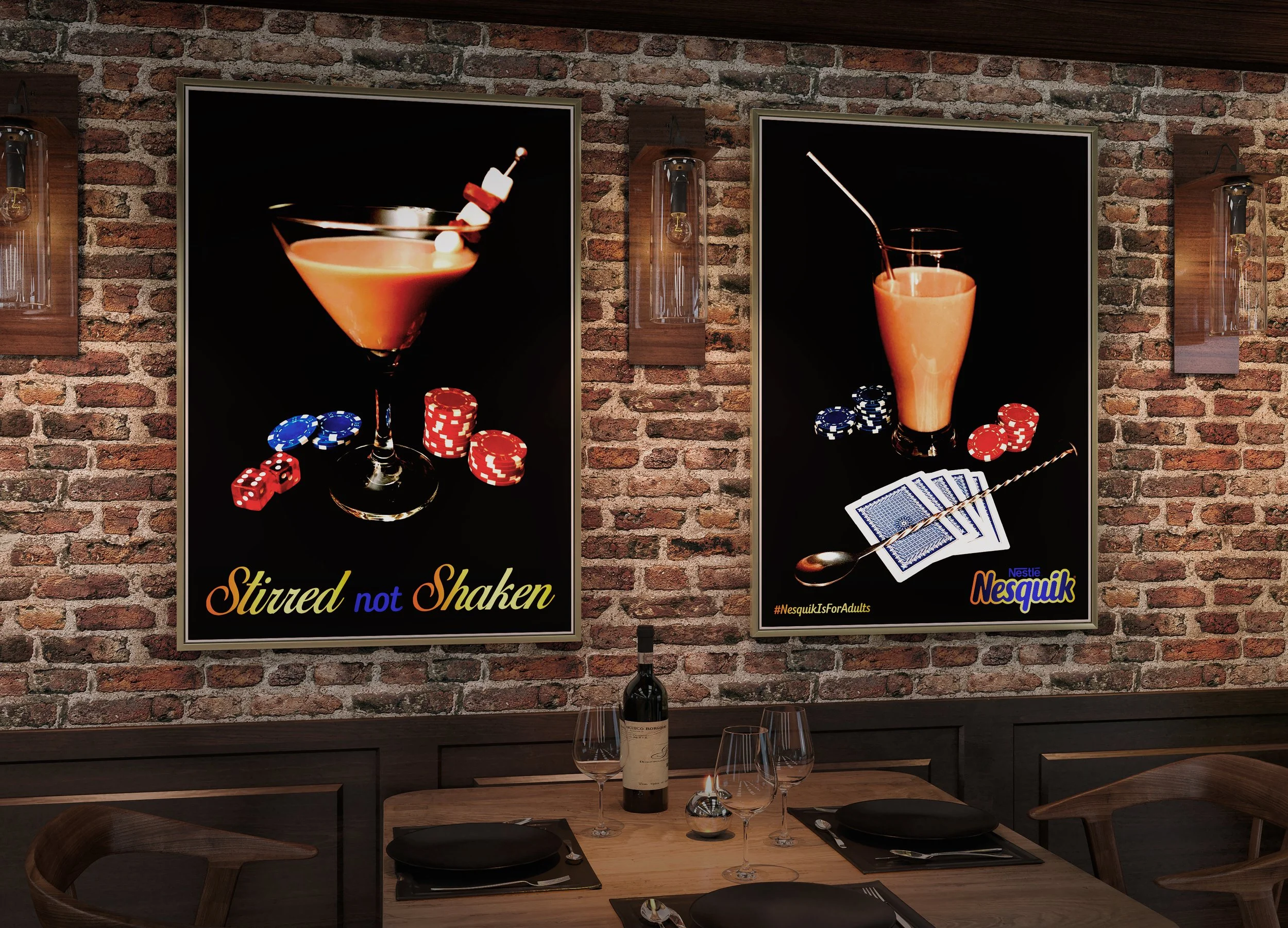 The main concept of this project is to advertise chocolate milk to an older demographic. Nesquik has historically only marketed their drinks to children which leaves a substantial portion of general audiences. My strategy was to combine the nostalgia of chocolate milk with classy beverage photography. Target Audience: Adults 21+